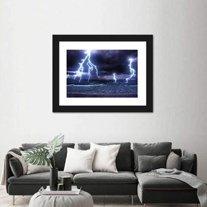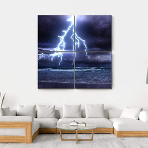 This canvas art depicts a powerful lightning storm over the ocean, capturing the intensity of dark stormy clouds and crashing waves. The dramatic scene is enhanced by striking blues and purples that create an moody atmosphere, perfect for any wall decor.