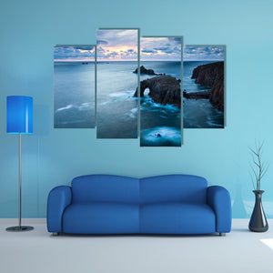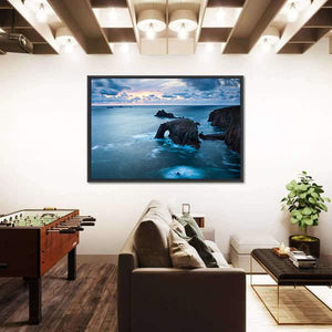 This canvas art features dramatic coastal rock formations under a stormy sunset at Lands End. The serene palette of blue, gray, and orange evokes a sense of calm amid nature's power, making it a striking addition to any modern decor.