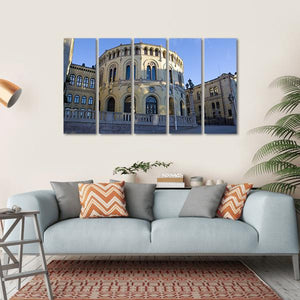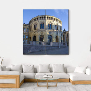 Capture the grandeur of Oslo's Stortinget with this realistic canvas wall art. The sunny depiction highlights the parliament building's stunning architectural details, such as arched windows and sturdy columns, all set against a clear blue sky. This piece makes an impressive addition to any space where history comes alive.