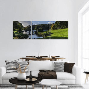 Stourhead Gardens presents a panoramic view of a stone-arched bridge spanning a river, surrounded by trees and grassy banks in greens, blues, browns, and gray. The scene feels serene and natural, and it works well as a calm focal point in living rooms, studies, or hallways.