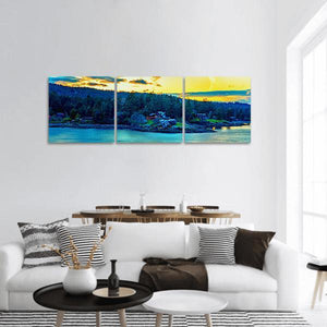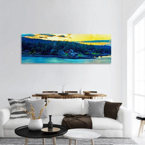 A panoramic landscape that combines coastline, forest, calm water and a cluster of small houses in a blue‑green palette. The scene feels serene and scenic, with trees on a hill and still water — a modern canvas suited to contemporary or lake‑inspired rooms.