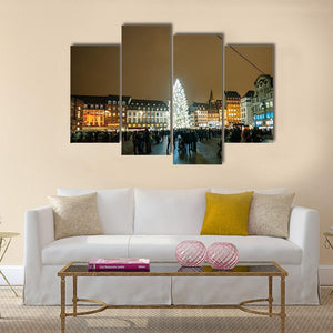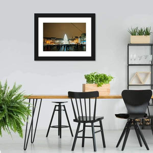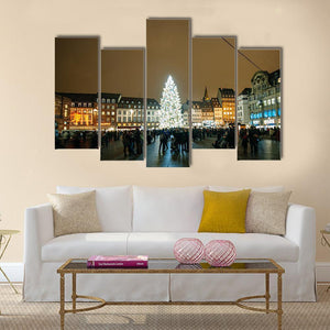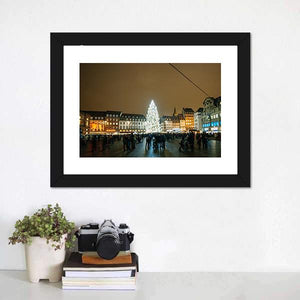 A realistic cityscape of Strasbourg’s town square centered on an illuminated Christmas tree, with people gathered under warm lights against a dark winter sky. The scene reads festive and bustling, captured from an eye-level wide perspective. It works well as holiday wall decor or a cozy seasonal focal point in a room.