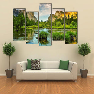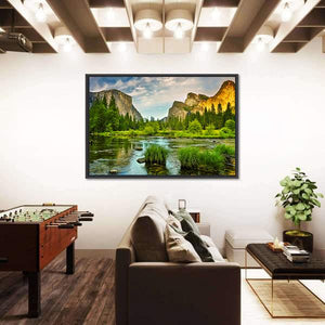 This canvas wall art captures a serene river flowing through Yosemite, framed by majestic mountains and lush forests. The naturalistic style, combined with a palette of greens, blues, and earthy tones, creates a peaceful atmosphere that invites calm into any space.