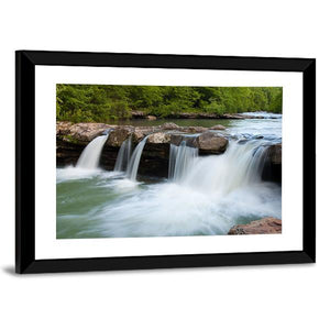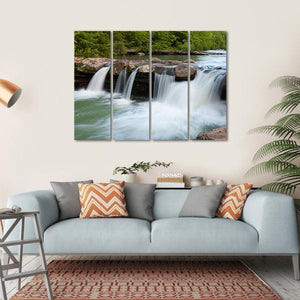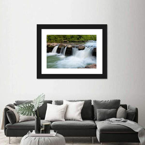This captivating piece features a serene waterfall cascading through a lush forest, complemented by a tranquil river and rugged rocks. The photorealistic style showcases a beautiful palette of green, blue, and brown, creating a natural and calming atmosphere for any space.