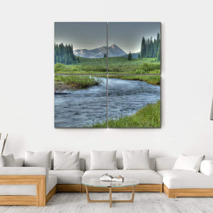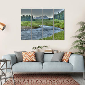 This landscape artwork captures a serene summer scene of a flowing river surrounded by mountains, forests, and grasslands. The gentle motion blur on the river adds a sense of tranquility, making it a beautiful addition to any nature-inspired decor.