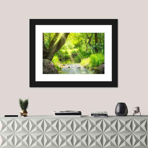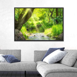 This piece captures a tranquil forest stream, with sunbeams filtering through lush greenery. The vibrant greens and blues create a serene atmosphere, perfect for nature lovers.