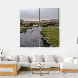 This canvas features a serene river winding through Dartmoor, framed by grassy banks and trees beneath an overcast sky. The calm, somber tones of green, gray, and brown evoke a rustic connection to nature, making it a lovely addition to your wall decor.
