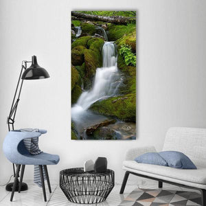A realistic landscape showing a summer stream and waterfall in Norway, with flowing water over moss-covered rocks surrounded by green forest. The scene uses depth and the rule of thirds to create a serene, natural feeling. Suits nature-inspired or modern rooms as a calm focal piece.