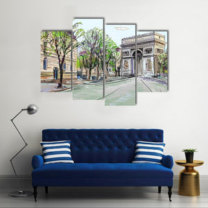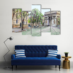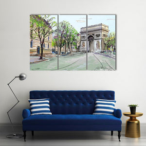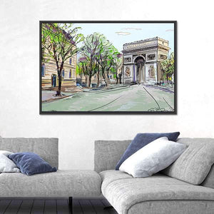 This vibrant cityscape captures a charming Paris street, featuring the iconic Arc de Triomphe and surrounding trees. With a sketchy, impressionistic style and a lively palette of greens, blues, and tans, it invites warmth and urban flair into your space.