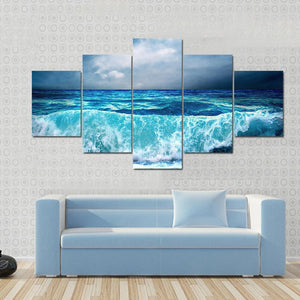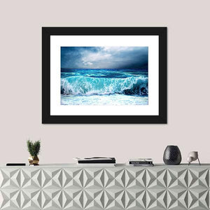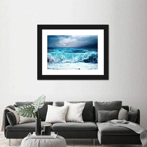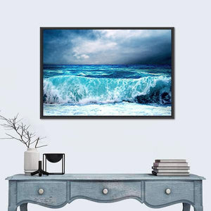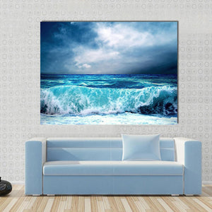 This canvas artwork features a dramatic seascape with an ocean wave crashing under a stormy sky. The powerful imagery and turbulent palette of blue, grey, and black create an awe-inspiring atmosphere, perfect for adding character to modern decor.