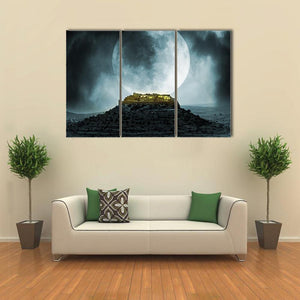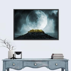 An ancient village sits on a rocky hill beneath a large full moon. Dark clouds, glowing windows, and a limited palette of deep blues and blacks give the scene a mysterious, dramatic, and slightly eerie mood—good for modern or moody room decor.