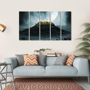 This captivating canvas features ancient ruins under a large, glowing moon in a stormy sky. The dramatic shades of dark blue and grey create an eerie atmosphere, making it a stunning addition to any space.