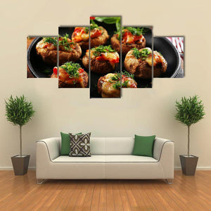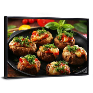 Stuffed mushrooms and vegetables appear in a close-up, overhead food photograph with warm, appetizing tones. Mushrooms stuffed with cheese and herbs sit on a black plate, making the image well suited to kitchens, dining rooms, or casual restaurant spaces.