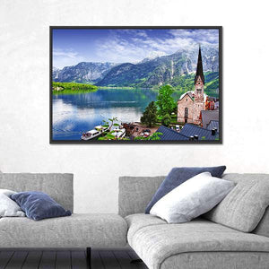 This beautiful canvas art captures the serene landscape of Hallstatt, Austria, featuring tranquil blue waters, lush green mountains, and a charming village with a classic church steeple. It’s a picturesque depiction perfect for adding a touch of calmness to your décor.