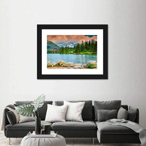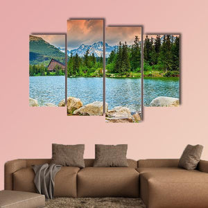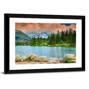 This realistic canvas depicts a mountain lake in Slovakia with an eye-level view framed by trees and a wooden cabin on the shore. Calm and majestic, the scene pairs blue-green water, large foreground rocks and a dramatic cloudy sky, and is well suited for modern or nature-inspired interiors seeking serene landscape wall art.