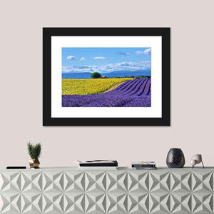 This canvas art features a picturesque rural landscape, showcasing vibrant rows of lavender and sunflowers under a bright blue sky. The serene scene, with a charming house and distant mountains, adds a touch of nature's beauty to any space.