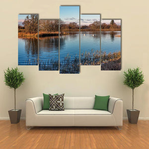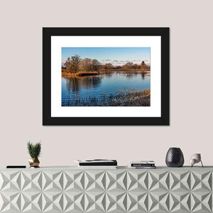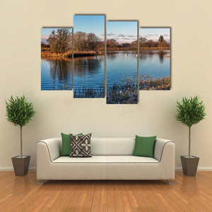 This canvas art captures a serene Scottish loch, featuring a tranquil lake surrounded by trees and two graceful swans. The calming palette of blues and greens enhances the peaceful atmosphere, making it a beautiful addition to any space.