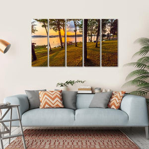This canvas art captures a serene lake at sunset, where warm hues of orange and yellow blend over the water. You'll notice the long shadows of trees on a grassy hill, adding to the tranquil atmosphere of the scene.