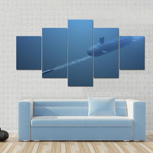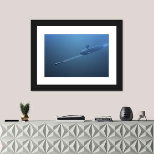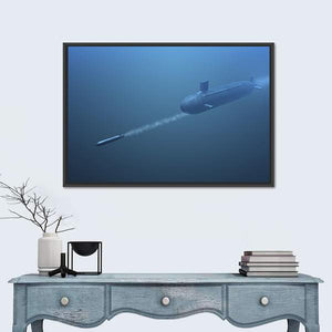 This striking canvas art features a submarine in action, capturing the tension of underwater exploration. With a captivating blue and white palette, it highlights the submarine's wake and the trailing torpedo, creating a sense of depth and movement.