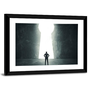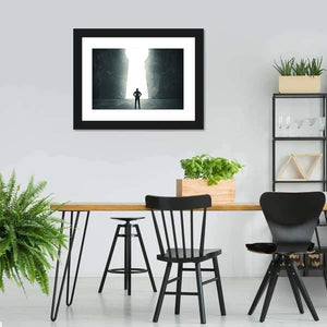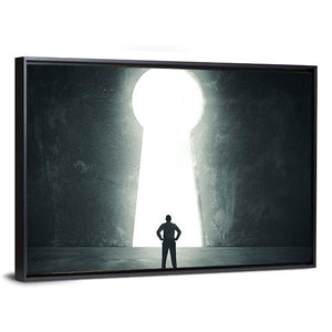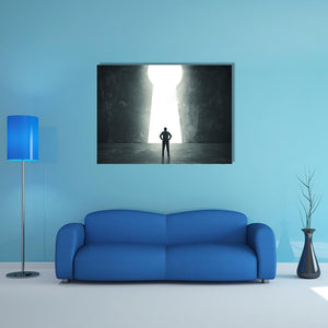 Concept Of Success features a lone silhouette of a man standing in a dark room beside a large, illuminated keyhole-shaped opening. The minimalist, modern composition uses dark gray, black, and white with strong framing and negative space to create a mysterious, hopeful, introspective atmosphere; it fits well in modern or minimalist interiors and workspaces.