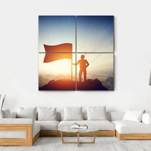 This canvas wall art features a silhouette of a person holding a flag against a stunning sunset backdrop with mountains. Its vibrant palette of orange, blue, and gray inspires feelings of triumph and peace, making it a powerful addition to your space.