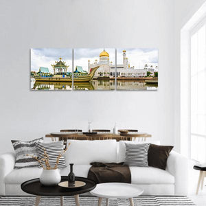 This panoramic canvas features the Omar Ali Saifuddien Mosque with golden domes, an ornate boat and their reflections on calm water, offering a serene, majestic scene. Rendered in realistic tones of gold, white, blue and green, it suits modern living rooms or quiet sitting areas.
