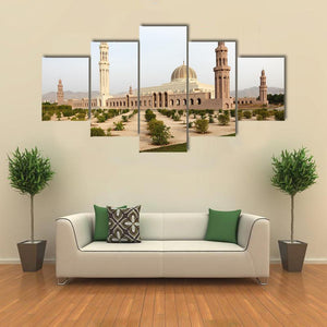 This canvas art features the stunning Sultan Qaboos Grand Mosque in Muscat, showcasing its grand minarets and ornate dome amidst serene gardens. The peaceful atmosphere and realistic style make it a beautiful focal point for any space.