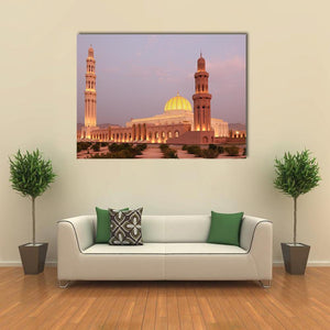Honor the majestic beauty of the Sultan Qaboos Grand Mosque with this canvas wall art. Featuring intricate architecture, minarets, and a dome set against a serene dusk sky, this piece embodies a spiritual aura. Its warm palette of yellow, tan, purple, and green invites calm into any space.
