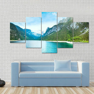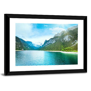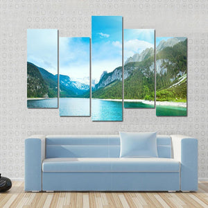 This canvas art captures the serene beauty of Lake Gosausee in Austria, showcasing tranquil waters, majestic mountains, and a bright sunburst in the sky. The rich blues and greens evoke peace and nature's splendor, making it a perfect addition to any landscape lover's decor.