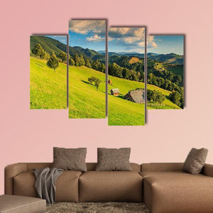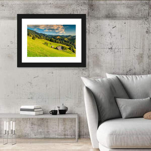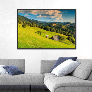 A peaceful summer alpine landscape in Romania featuring rolling green hills, forests, farmhouses with a thatched-roof main house and a small red-roofed building under a clouded sky. Composed with rule-of-thirds and clear depth, the scene feels idyllic and serene—well suited to rustic or nature-inspired room decor.