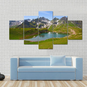 Capture the tranquility of a summer day in the Swiss Alps with this beautiful canvas wall art. Featuring a serene mountain lake surrounded by snow-capped peaks and lush green hills, it adds a peaceful touch to any space.