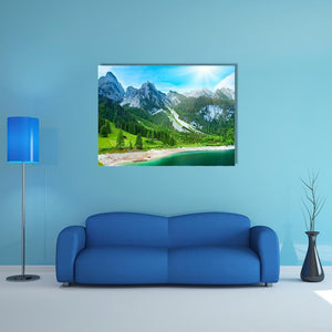 A vibrant, photorealistic view of an alpine mountain range beside a clear lake, with sunlight beaming through clouds and a tree line along the water. The scene feels serene, majestic, and bright, with green and blue tones that suit modern home decor and living rooms.