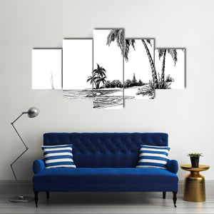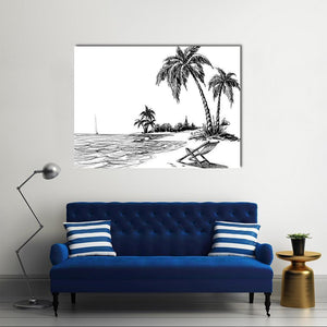 This canvas art captures a serene beach scene filled with palm trees, a deck chair, and a sailboat sketched in black and white. Its tranquil vibe makes it an ideal addition to any room seeking a touch of tropical charm.