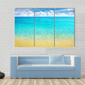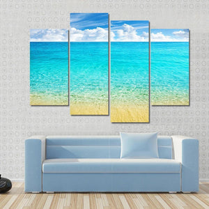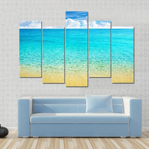 This canvas wall art captures a serene summer beach scene with clear turquoise waters and a vibrant sky dotted with clouds. The peaceful atmosphere invites you to relax and enjoy the beauty of nature, making it an ideal addition to coastal-themed decor.