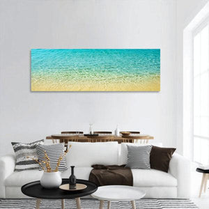 This beautiful canvas art captures a serene beach scene with clear water and gentle waves. The calming hues of blue, teal, and white evoke a refreshing atmosphere, perfect for any nature-inspired decor.