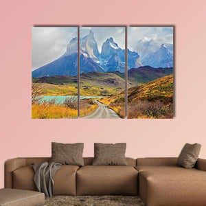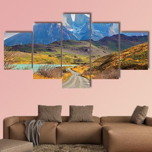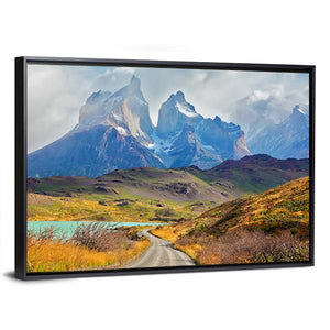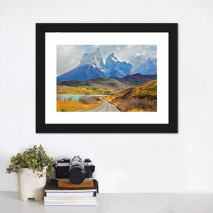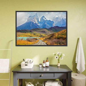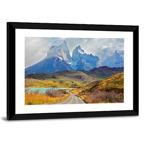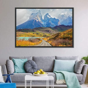 Majestic Peaks Of Los Kuernos depicts snow-capped, rocky mountain peaks with a winding road, a calm lake and grassy hills stretching into the distance. Rendered in blues, greens, browns, yellows, whites and greys, the scene reads as epic, serene and quietly adventurous. It suits modern home decor and nature-focused rooms that welcome scenic landscape art.