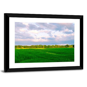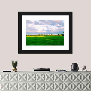 A photo-realistic panoramic landscape of sunlit grassy fields, a distant forest, and dramatic summer clouds. The scene feels serene and expansive, with a green-and-blue palette that suits modern, nature-focused interiors.