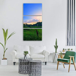 A nature photography print of summer fields and trees bathed in warm sunset light. The scene feels peaceful and tranquil, with dense green vegetation, a blue and orange sky with soft clouds, and a lone dead tree stump that adds quiet interest. It suits living rooms or bedrooms and complements modern, nature-inspired decor.