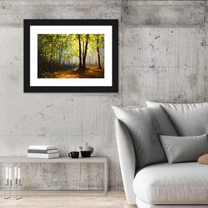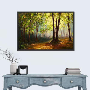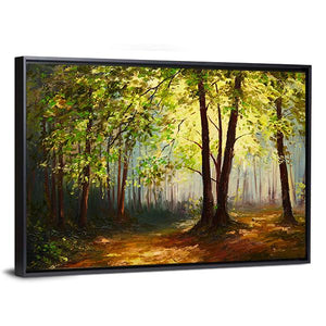 This serene canvas art features a tranquil forest scene with sunlight filtering through vibrant green and brown trees. Its impressionistic style invites a warm and peaceful atmosphere, making it a beautiful addition to any space.