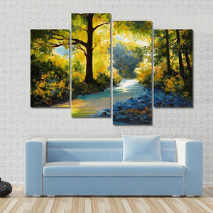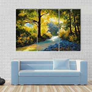 This vibrant canvas artwork features a serene summer forest scene with trees, a gentle stream, and beautiful violets. The impressionistic style captures depth and reflective water, creating a peaceful atmosphere perfect for enhancing any living space.