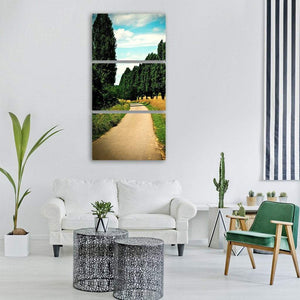 A tree-lined road beside a field of grain under a summer sky creates a peaceful, natural scene with clear depth of field. Greens, browns, blues, and touches of yellow give a calm, nature-focused look that suits living rooms, hallways, or other room decor.