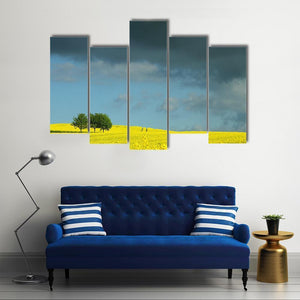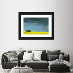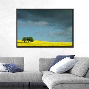 This canvas art captures a serene field of yellow flowers under a stormy sky, flanked by two trees. The dramatic interplay of colors creates a striking visual perfect for enhancing your living space.