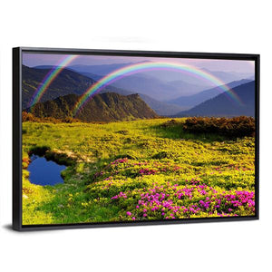 This canvas art features a serene summer landscape, showcasing majestic mountains, vibrant flowers, and a tranquil lake. A double rainbow arches gracefully across the sky, enhancing the peaceful mood of the scene.