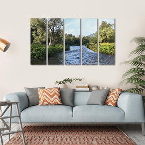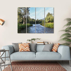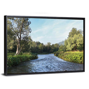 Experience the tranquility of a serene river scene with our Summer Misty Morning On The River canvas art. The realistic portrayal captures flowing water, dense foliage, and a partially cloudy sky, creating a peaceful atmosphere that brings nature into your space.