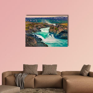 Bring the serene beauty of Iceland's Godafoss waterfall into your space with this vibrant canvas art. Featuring dynamic flows of bright turquoise water amidst rocky terrain and lush green hills, this piece captures the power of nature in a natural and invigorating way.