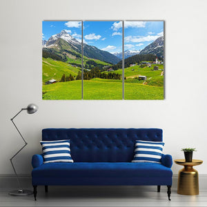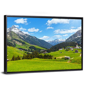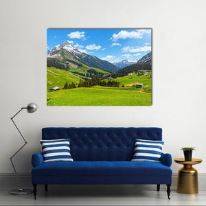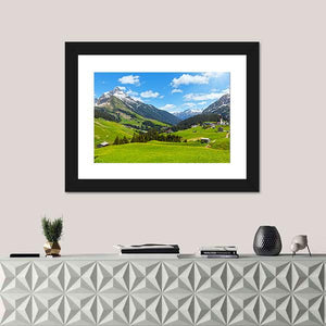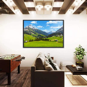 A realistic summer landscape showing a mountain valley with green meadows, scattered yellow flowers, pine trees and small wooden buildings beneath snow-capped peaks. The scene feels serene and picturesque, and it fits well in modern or nature-inspired room decor as a calm focal piece.