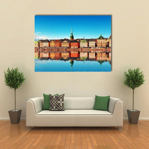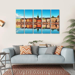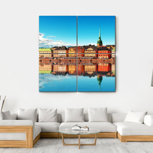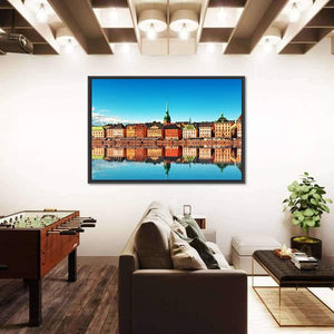 This canvas wall art features the picturesque cityscape of Gamla Stan, showcasing historic buildings and vibrant reflections on calm waters. The artwork's vivid palette of blues, oranges, and yellows evokes a serene atmosphere, perfect for brightening up your space.