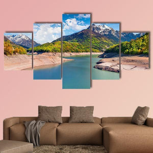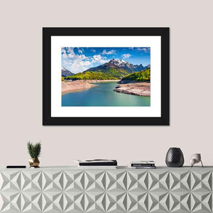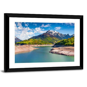 Summer Panorama Of Lac du Sautet captures lake, trees, sky and snow-capped mountains arranged with a rule-of-thirds composition. The daytime scene—rendered in blues, greens and whites—and a partially dry lakebed give the piece a peaceful, scenic, serene mood. This nature print suits modern or nature-focused room decor.