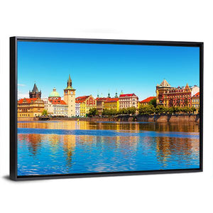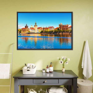 This realistic canvas print captures a summer view of the Old Town in Prague, with old architecture and buildings reflected in a calm river beneath a bright blue sky. The photographic, horizontally balanced composition and a palette of blues, yellows and warm browns create a vibrant yet peaceful scene that fits modern living rooms, studies, or entryways.