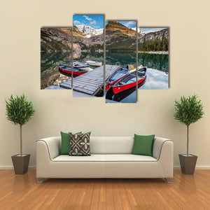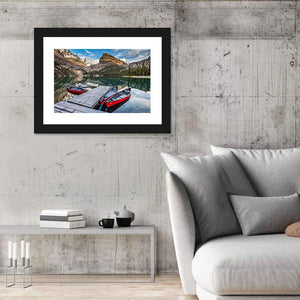 Lake, snow-capped mountains, canoes and a wooden dock appear in a realistic landscape canvas that conveys a serene, peaceful and quietly adventurous summer scene in the Canadian Rockies. The composition emphasizes depth and reflections with blue, green, brown and white tones—suited to modern home room decor.
